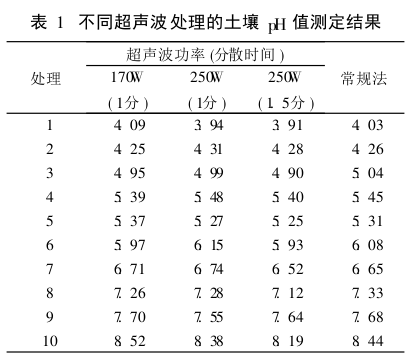 pH 值測定: 設(shè)超聲波功率 170 W 分散時(shí)間 1分、 250 W 1分和 250 W 1 . 5分 3個(gè)處理, 1次重復(fù), 分 3次完成。 其余操作與常規(guī)法相同。