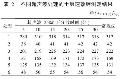 采用超聲波功率 170 W 分散 1分鐘測定土壤 pH 值、 250 W 10分測定土壤速效鉀、250 W 7分測定土壤銨態(tài)氮的處理結(jié)果與常規(guī)法比較, 進(jìn)行 t檢驗(yàn): t pH ( 9) = 0 . 27< t 0. 05 =2 . 26 , tk( 5) = 0 . 29< t 0 . 05 = 2 . 57 , t N ( 5) = 1 . 22<t 0. 05 = 2 . 57 。 說明以上處理方法與常規(guī)法不存在顯著性差異, 使用超聲波法分散土壤的測定結(jié)果是可靠的。