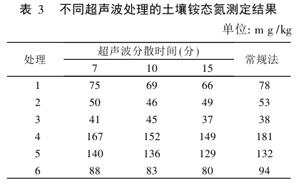 超聲波法測定銨態(tài)氮表明, 與常規(guī)法比較, 在 250 W 下分散 7分鐘的相對誤差為3 . 8 % ~ 7 . 9 % , 10分為 3 . 0 % ~ 18 . 4 % , 15分為 2 . 3 % ~ 17 . 7 %。 與平行測定結(jié)果允許相對誤差為≤ 10 % 比照, 250 W 分散 7分的處理結(jié)果在允許誤差范圍 (見表 3)。